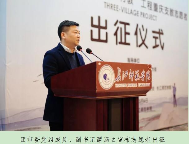 仪式上,长江师范学院相关领导向志愿者们授旗,全体志愿者进行庄严的支教服务宣誓,声声誓言表达了志愿者将本次支教做好的决心。最后,团市委党组成员、副书记谭涵之宣布志愿者出征,并向志愿者们提出三点要求:一是讲好脱贫故事,着力坚定贫困人口子女脱贫信心。二是下足“绣花”功夫,尽力帮助贫困人口子女接受教育。三是汇聚社会力量,形成打好精准脱贫攻坚战强大合力。