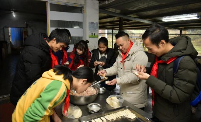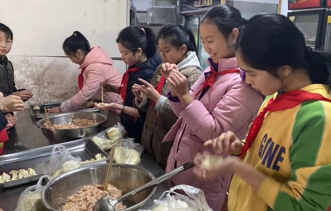 随后,与会嘉宾和同学们一起参与了包饺子的活动。与会嘉宾耐心地教给同学们各式各样的包饺子技巧,三角形饺子、十字形饺子、元宝饺子......同学们认真地学习不同的包法,并时不时地与嘉宾互动,整个现场充满了欢乐。