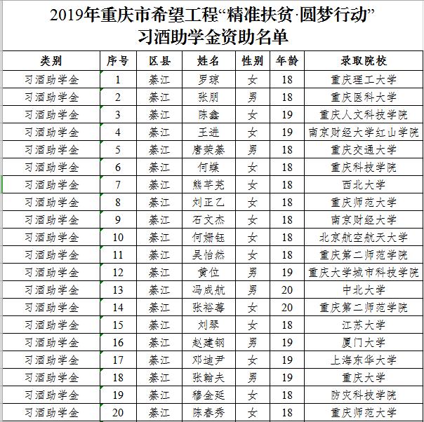 现将2019年重庆市希望工程“精准扶贫·圆梦行动”—习酒助学金